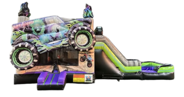 "The Legend Lives On!" Get ready for the ultimate "Monster Jam" experience in your own backyard. Our Grave Digger Monster Truck Combo is a massive, high-octane inflatable that brings the world’s most famous monster truck to life. Featuring the iconic Black, Neon Green, Blue, and Gray "spooky" graveyard theme, this unit is a guaranteed show-stopper for any Tampa event.
